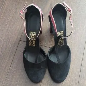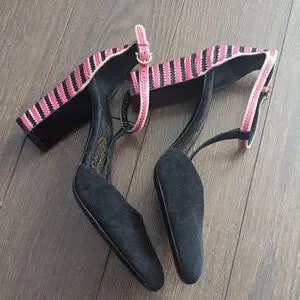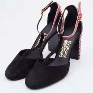 Step into style with Salvatore Ferragamo Suede/Leather Fergie Strap Pumps in Black/Pink. These chic pumps feature a unique strap design and premium craftsmanship, making them perfect for any occasion. A must-have for any fashionista.