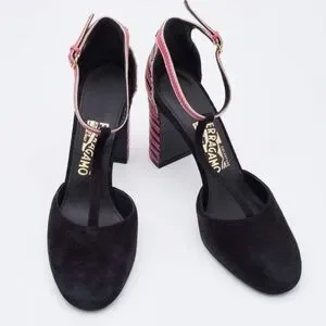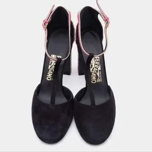 Salvatore Ferragamo Black/Pink Suede And Leather Fergie T-Strap Pumps