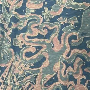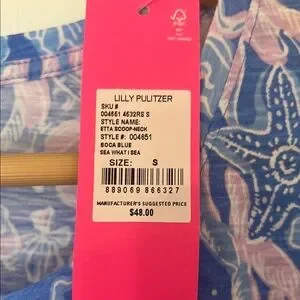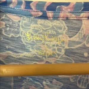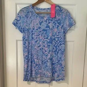 This Lilly Pulitzer t-shirt showcases a striking blue and white design, offering a fitted silhouette for a chic and comfortable fit. The short sleeves and lightweight fabric make it perfect for warm, sunny days, while the intricate pattern adds a touch of sophistication.