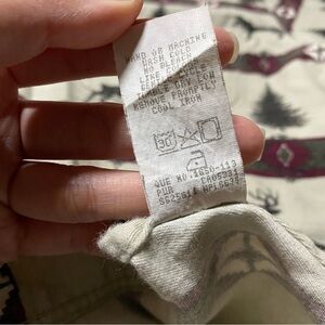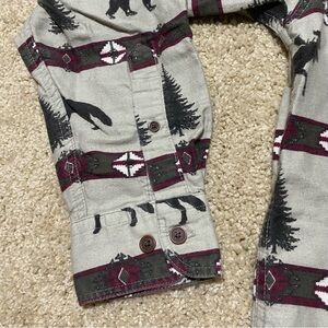 Woolrich Forest Aztec Flannel Long Sleeve Button Down Shirt. Size Medium. Grey color with burgundy red and forest green colors. Collared. Chest pocket. Additional buttons on bottom flap. Long sleeves with buttons at cuffs. Relaxed and oversized fit. Good condition with wash wear for the rugged look (see last photo).