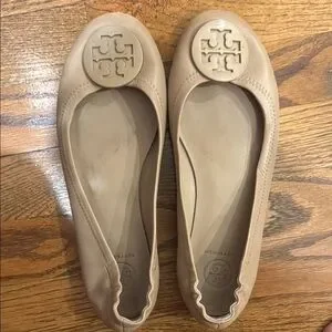 Elegant flats with iconic logo. Smooth tan leather. Perfect for daily style.