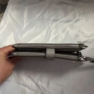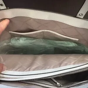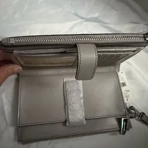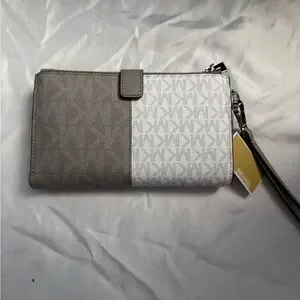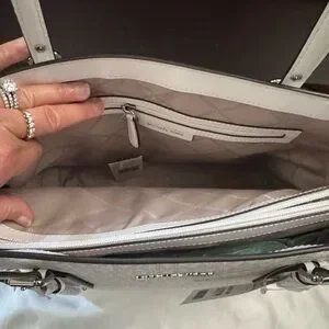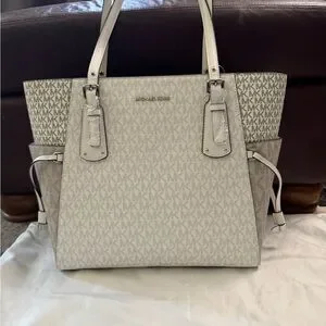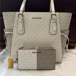 This Michael Kors tote bag showcases a sophisticated gray and cream color palette, enhanced by silver hardware. Its structured design and elegant leather trim make it a versatile choice for any occasion. Wallet included.