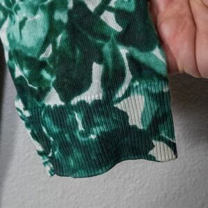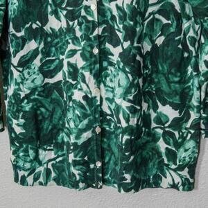 Talbots button-front blouse in a lush green floral print that channels garden-party energy through a botanical lens. Women’s size large. The knit is lightweight and softly structured, with deep green foliage layered over white in a pattern that feels both timeless and on-trend. Pearlized buttons and bracelet-length sleeves finish the look with quiet polish, perfect for those who lean classic but still want a touch of biophilic flair. The fabric drapes clean without clinging—easy to wear open over a tank or styled solo.