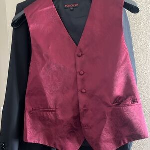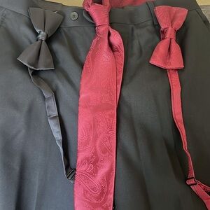 Worn once for a wedding. Comes with burgundy vest, tie, and bow tie and black bow tie.