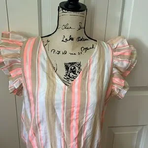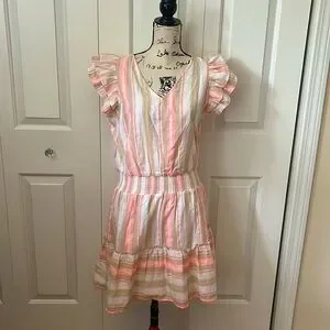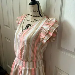 New with tags Vineyard Vines v neck ruffle sleeves dress. Fully lined, 91% cotton 9% polyester. Coral, tan and white stripe fabric. Size Medium- bust measures 20 inches across, elastic waist unstretched 15.5 inches, stretches to 20 inches and 36 inches long. $188