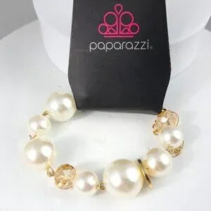 Pretty faux pearl bracelet accented with pale peach and gold beads.