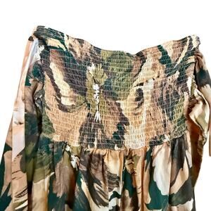 Girl and the Sun Waterfront Green and Yellow/Gold tropical floral pattern strapless wide leg Jumpsuit in Size Medium. This jumpsuit has long tie straps that may be wrapped around a multitude of ways. The back is shirred for a comfortable fit.