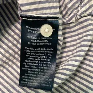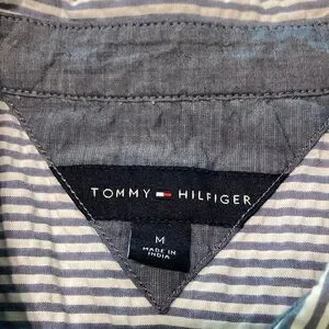 This button-down seersucker shirt by Tommy Hilfiger showcases a relaxed fit with a classic dress shirt collar, perfect for versatile styling. The crisp blue and white color scheme adds a touch of elegance, making it suitable for both casual and business casual occasions.