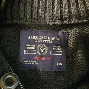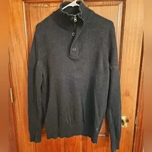 This classic 1/4 zip-up sweater from American Eagle Outfitters is crafted from a cozy knit material, featuring a standing collar for added warmth. Its versatile design makes it perfect for everyday wear, offering both comfort and style. Color is a very dark green, appears almost black.