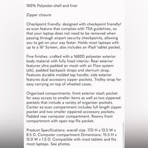 Brand new, with tags. Tons of compartments and organizing pouches. Has a trolley tunnel for easy travel.