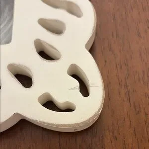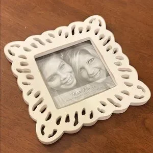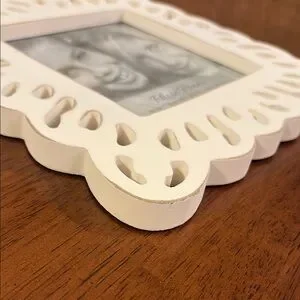 NWOT white painted wood picture frame features a delicate lace-like pattern, adding a touch of elegance to any space. Its intricate scrollwork and openwork designs create a vintage-inspired accent that. See all photos for hanging on the wall only. Picture hanger on the back.