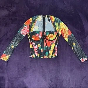 Multicolor Floral Mesh Long Sleeve Corset Top Size M