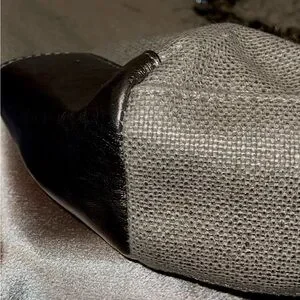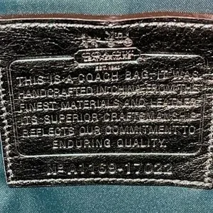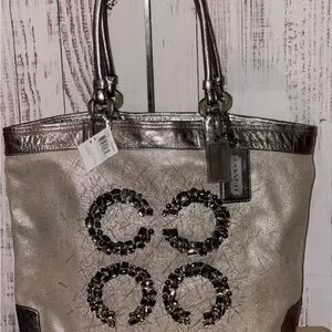 This Coach tote bag features a stunning metallic silver finish, beautifully contrasted by rich brown accents. The spacious design and double handles make it both stylish and practical for everyday use. Its elegant appearance is enhanced by the signature Coach logo patterns, adding a touch of sophistication to any outfit.