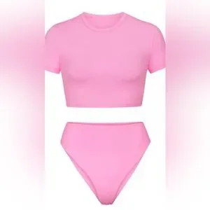 Dive into elegance with the SKIMS light pink bikini, designed to offer a flattering fit and vibrant color for your beach adventures. This chic swimwear combines style and comfort, making it a must-have for your summer wardrobe. Features a cropped, short-sleeve swim top and mid rise, cheeky swim bottoms. Both pieces offered in a size extra-large.