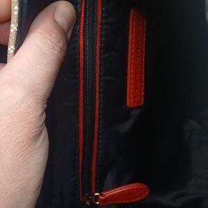 Stylish backpack with a monogram pattern. Features a brown flap and a striped accent.