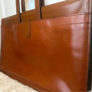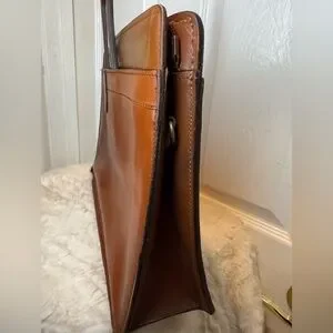 This brown leather briefcase boasts a sleek, structured design, perfect for a professional setting. Crafted from high-quality leather, it features a polished finish and a classic, timeless appearance. The briefcase is equipped with sturdy top handles, making it both functional and stylish for everyday use.