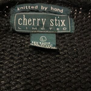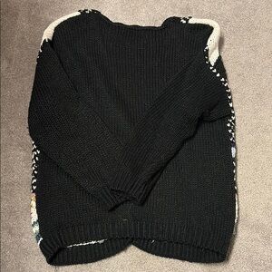 Hand knit sweater featuring a striking floral pattern against a classic black backdrop. The V-neck design and traditional knit style make it a timeless addition to any wardrobe. Perfect for those who appreciate bold, vintage-inspired fashion.