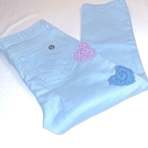 Women’s EUC MICHAEL KORS Lgt Blue Women's Jeans Sz 8 Handmade Crocheted Hearts put on them.
