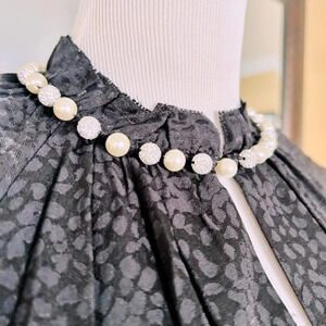 For Kate Spade, a pearl necklace is always in style. The graphic animal print on this black silk shell make a simple silhouette shine bright. Look closely and you'll find sparkle on some of the faux pearls. It’s finished with picot-trimmed flutter sleeves sleeves that add to the femininity of this piece.