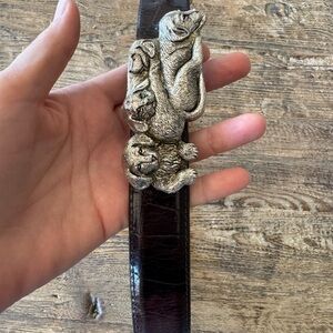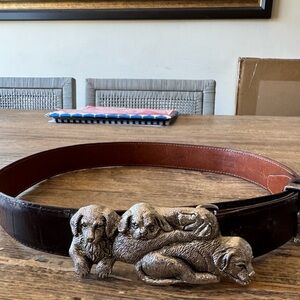 Vintage Wathne (1980’s) Wathne belt and buckle. Brown leather original croc belt. Has a cute slider belt silver puppy (see pic) in great condition. Was hardly worn. Size 30 stamped on belt interior. Will fit a size 6-8 women.