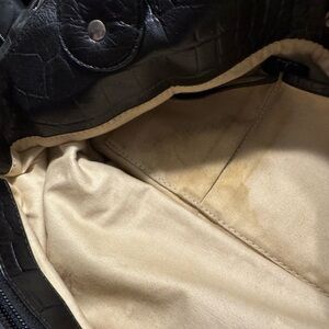 Elegant black leather bag by Le Tanneur. Features silver hardware and embossed details.