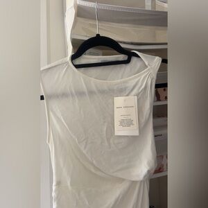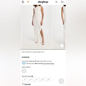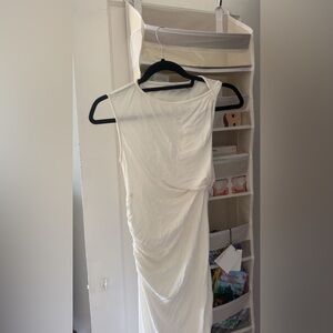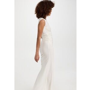 This stunning sleeveless maxi dress by Christopher Esber features a sophisticated ruched design and a daring side slit, perfect for a bride or wedding guest. The crew neck and sheath silhouette create a modern and elegant look, while the white and cream hues add a touch of timeless elegance.