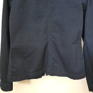 This women’s Medium Fox Riders Company utility jacket is a lightweight, breathable cotton piece that blends streetwear, moto, and military-style fashion. Made from 100% cotton, this black utility jacket features both zipper and button front closures, two upper front pockets with button flaps, and two lower front cargo-style snap pockets for secure, functional storage. Decorative button tabs on the shoulders and engraved “FOX” buttons add a rugged, moto-inspired look. The front includes tonal brand embroidery, with “FOX RIDERS COMPANY” stitched above the left chest pocket and a small Fox Racing head logo on the right lower pocket, when worn. Functional metal eyelets under the arms provide ventilation, while an additional pair on the lower right pocket adds utilitarian edge. This black cotton utility jacket has a structured, slim fit and unlined interior, making it the perfect transitional layer for spring, fall, and cool summer nights. Great for pairing with jeans and combat boots for a laid-back, pulled-together outfit. Perfect for fans of casual, alternative style with a grunge or minimalist twist, this jacket adds an edgy, vintage vibe to any wardrobe.