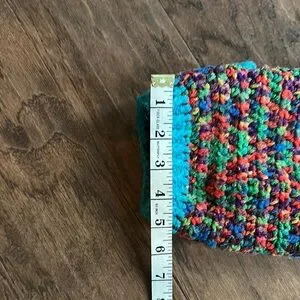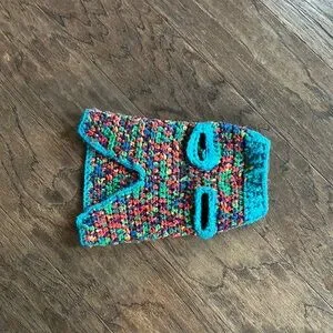 Handmade, vibrant, crocheted dog sweater with a mix of colors. Perfect for keeping your pet warm and stylish.