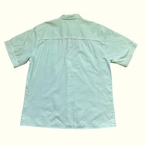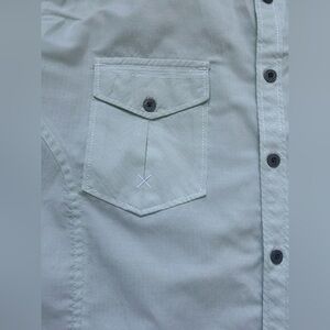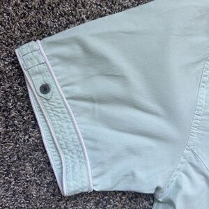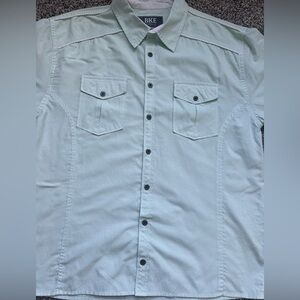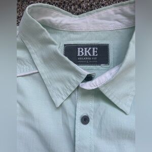 BKE Relaxed Fit men’s very light mint green with white stitching and trim button up collared shirt. Unique style and perfect for a summer night out or wedding guest attire.