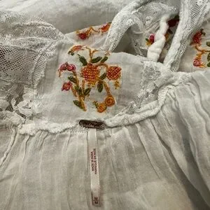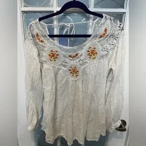 This chic white blouse by Free People showcases a graceful ruffled design with long sleeves, offering a blend of elegance and comfort. The tie front adds a playful touch, making it a versatile choice for both casual and formal settings. Embellished details enhance its sophisticated appeal, ensuring you stand out in any crowd.