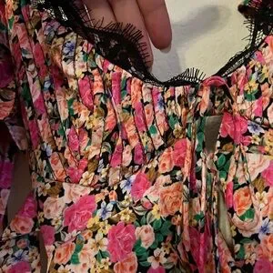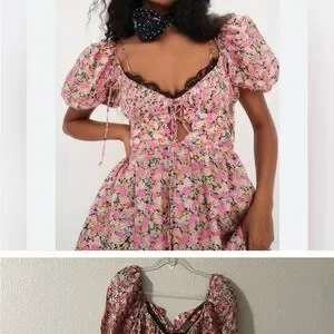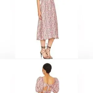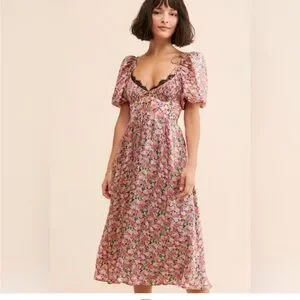 This elegant sundress by For Love And Lemons features a sweetheart neckline and short puff sleeves, ideal for a wedding guest or cocktail occasion. The dress is adorned with a romantic floral print in pink and red hues, complemented by a flowy A-line skirt that exudes a light and airy charm. NWT