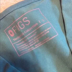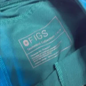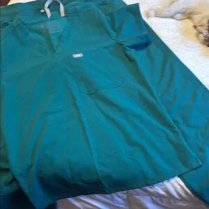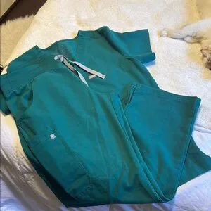 Stylish jade green scrub top by Figs. Features a V-neck and chest pocket. Perfect for healthcare settings. This is the set no rips petite med pants and small top. Slightest fading barely noticeable. Does come from a cat home will be washed and dried before sent out