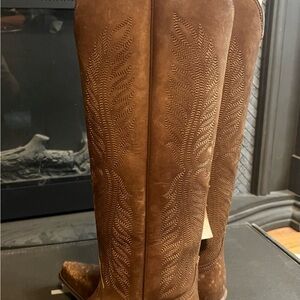 These Ariat heeled boots feature a rich brown hue and a classic western design, perfect for adding a touch of elegance to any outfit. Crafted with attention to detail, they offer both style and comfort, making them a versatile addition to your footwear collection.