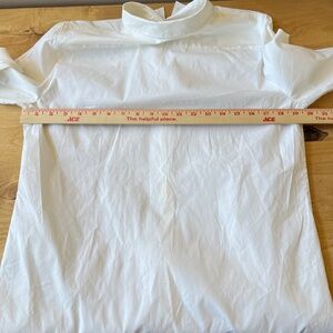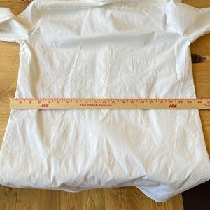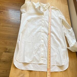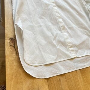 Hidden button front, side slits, collar, roll up cuffs, crisp white cotton elastane blend, lightweight.