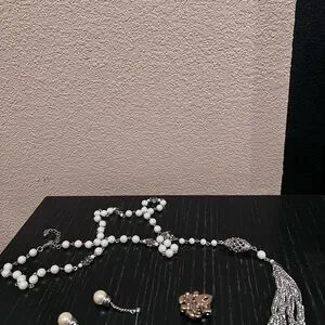 This elegant necklace set features a stunning combination of silver and pearl, perfect for adding a touch of sophistication to any outfit. The intricate design and high-quality materials make it a must-have for any jewelry collection. With earrings and brooch