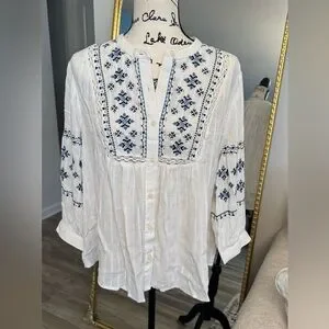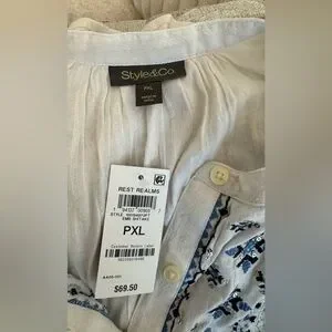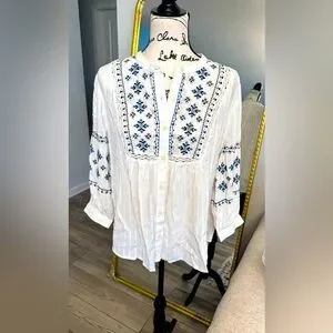 Style & Co. White Blouse with Blue Embroidery