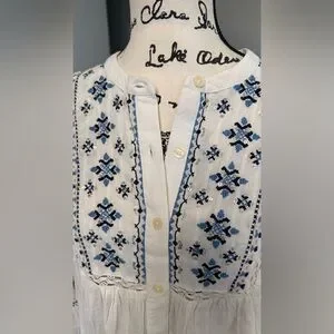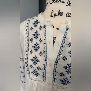 Chic white blouse with blue embroidered patterns. Button-down front. Casual and stylish.