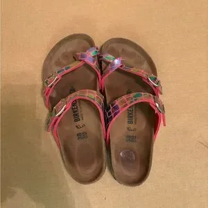 Experience the perfect blend of comfort and style with these Birkenstock sandals, featuring a vibrant pink and blue design. The adjustable straps ensure a secure fit, while the classic cork-like footbed provides all-day support. Ideal for casual outings, these sandals are a must-have for any wardrobe.