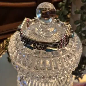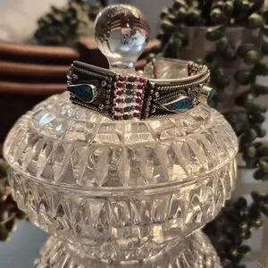 This gorgeous bracelet features vibrant turquoise stones set in a detailed sterling silver artisan design, accented with delicate aqua, red and silver beads.