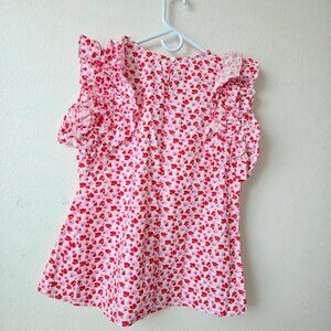 Chic floral blouse with ruffle details. Features vibrant red flowers on a white background.