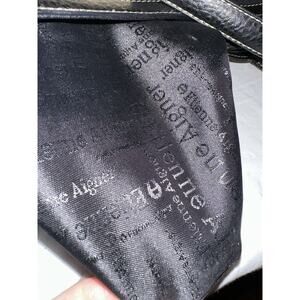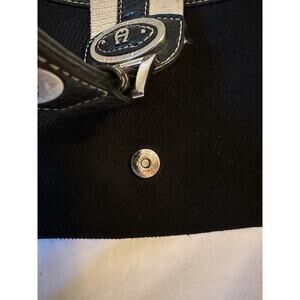 Ettienne Aigner vintage bad made of 100% cotton trimmed with leather. Beautiful and clean satin-y lining. Main center compartment and a front and back pocket. Nice hardware with Aigner emblem on front. Front buckle isn’t functional but has a snap behind it. Very very nice shoulder bag.
