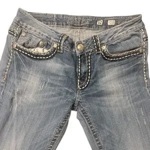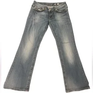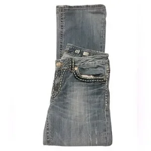 These Miss Me jeans feature a classic Irene boot cut in a timeless blue hue, enhanced by a distressed finish for a vintage-inspired look. The denim's natural fading patterns add character, making them a versatile choice for casual outings. Crafted with attention to detail, these jeans offer both style and comfort.