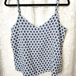 This stylish camisole showcases a fitted crop design in a vibrant blue and white color scheme. Its sleeveless construction and lightweight fabric ensure comfort and breathability, making it ideal for warm days. The geometric pattern adds a contemporary flair to this versatile top.