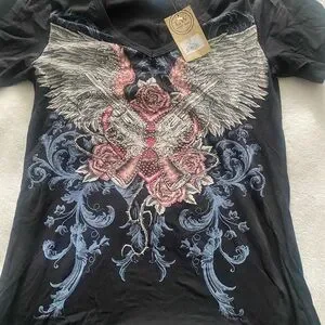 This Liberty Wear t-shirt showcases a striking graphic design with silver and gray wings, complemented by red floral accents and blue scrollwork. The short sleeves and black base color enhance the bold, embellished style, making it a standout piece in any wardrobe.