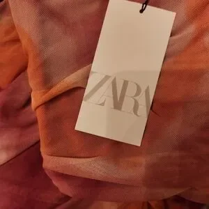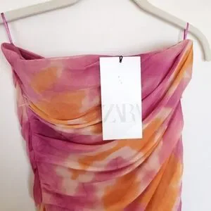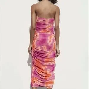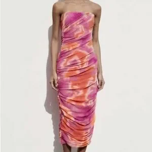 ZARA Tie Dye Strapless Midi Dress Womens Small Pink Orange Tulle