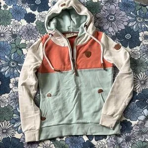 Stylish colorblock hoodie by Wanakome. Features coral, mint, and cream sections. Comfortable and trendy design. Perfect for casual wear or your next hike. Good condition. One small mark on left arm shown photos.