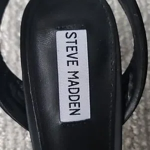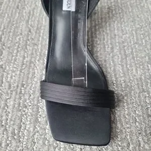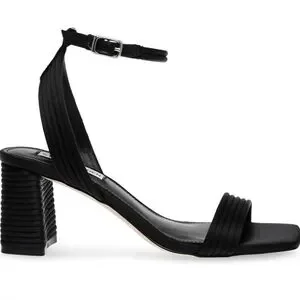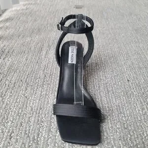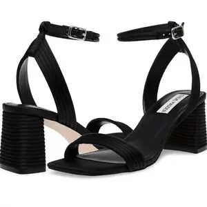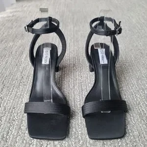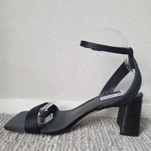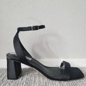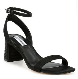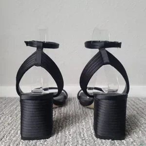 Elegant black strappy heels. Features a block heel and ankle strap. Perfect for any occasion.