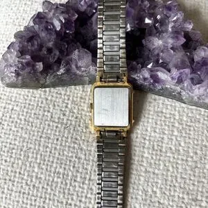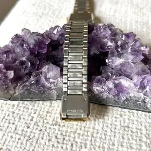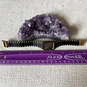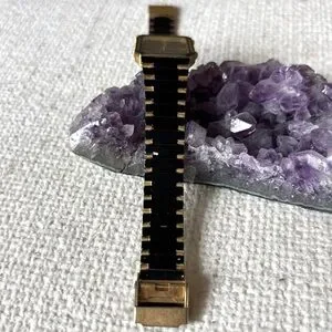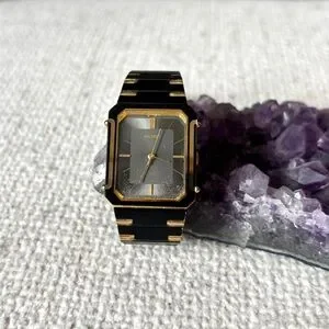 This is a Stylish Vintage Seiko watch with a sleek black and gold design. Features an octagon face and bold accents. The watch has some wear and tear to the band - please see photos before purchasing! This would be a great option for a watch repair, new battery, or to use for parts.