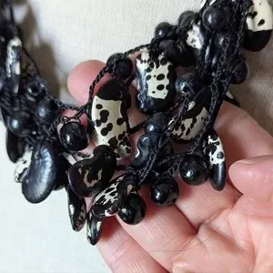 This stunning black and white beaded necklace was made in Columbia, South America from black and white kidney beans. The beans are so light weight.