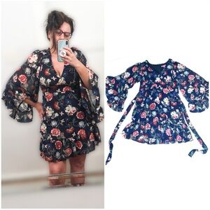 Betsey Johnson Coquette Floral Print Boho Wrap Tie Ruffle Bambi Mini Dress
